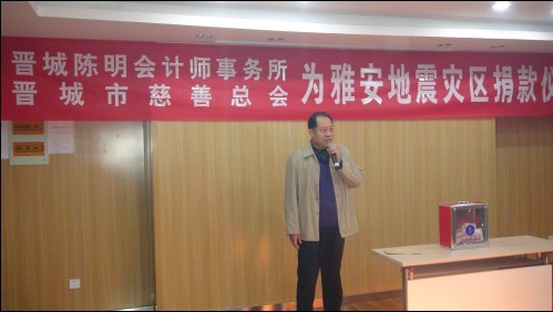 2013年4月28日下午三時,陳明集團(tuán)會議室里愛意濃濃,正在舉行為雅安地震捐款獻(xiàn)愛心活動,此次捐款活動我們有幸請到了晉城市慈善總會陳副會長光臨并作了重要講話,表示一定將陳明集團(tuán)全體員工的愛心送到雅安同胞手上。